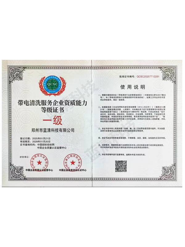 产品名称: 带电清洗服务企业资质证书 一级